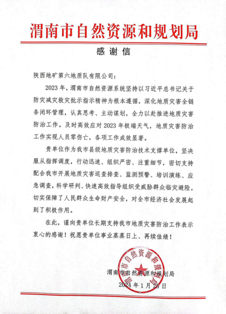 2024年1月26日,渭南市自然資源和規劃局向我公司發來感謝信,對陜西地礦第六地質隊有限公司為渭南市地質災害防治工作做出的貢獻和辛勤付出表示衷心的感謝。